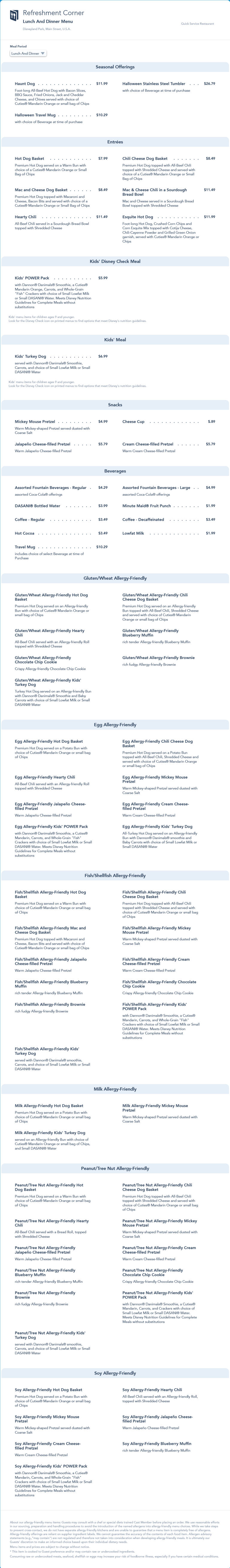 This menu was replaced by an updated menu in November 2021 that removed the Halloween seasonal items and add the Christmas seasonal Spicy Meatball Sandwich, Jingle Bell Glow Cubes and Holiday Travel Mug.