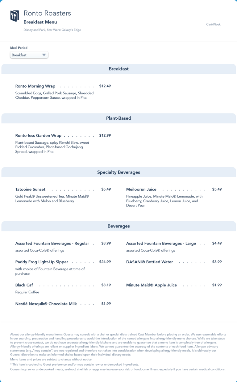 Original breakfast menu from July 2021. This menu was replaced by an updated breakfast menu in September 2021 that increased the price of the Specialty Beverages by $.50, from $5.49 to $5.99.