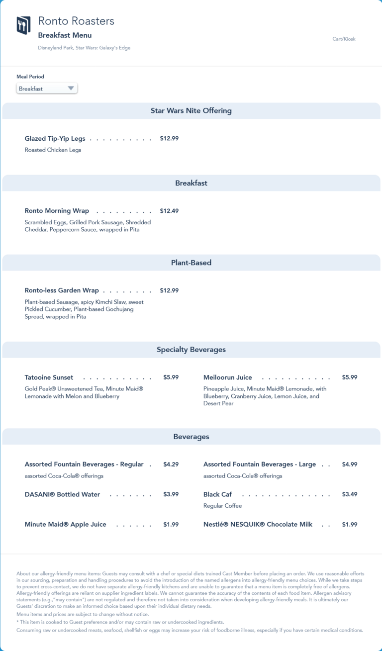 Ronto Roasters Breakfast Menu - Star Wars Nites 2022