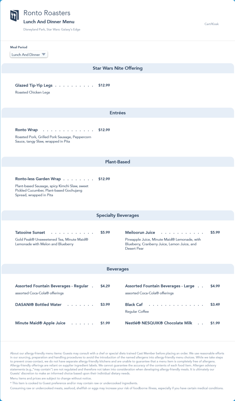 Ronto Roasters Lunch/Dinner Menu - Star Wars Nites 2022