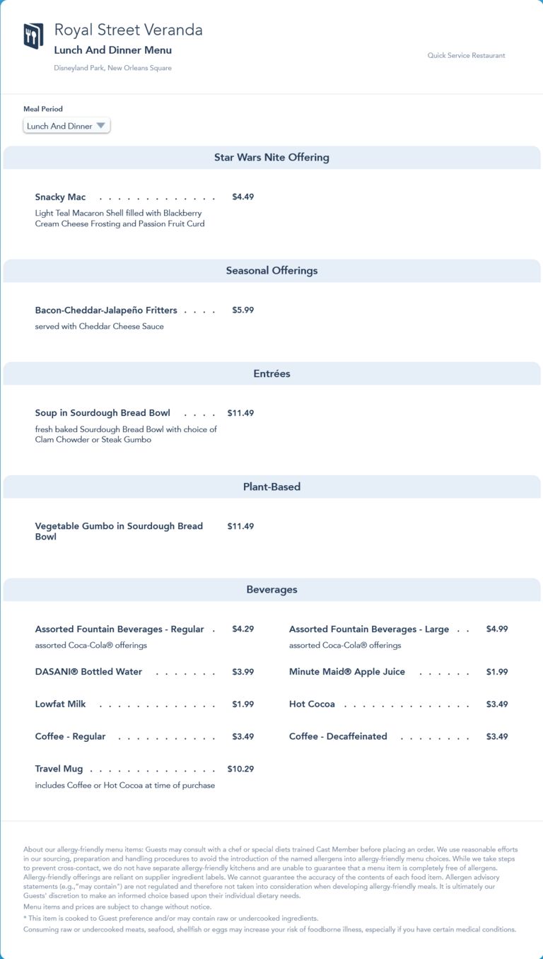 Royal Street Veranda Lunch/Dinner Menu - Star Wars Nites 2022
