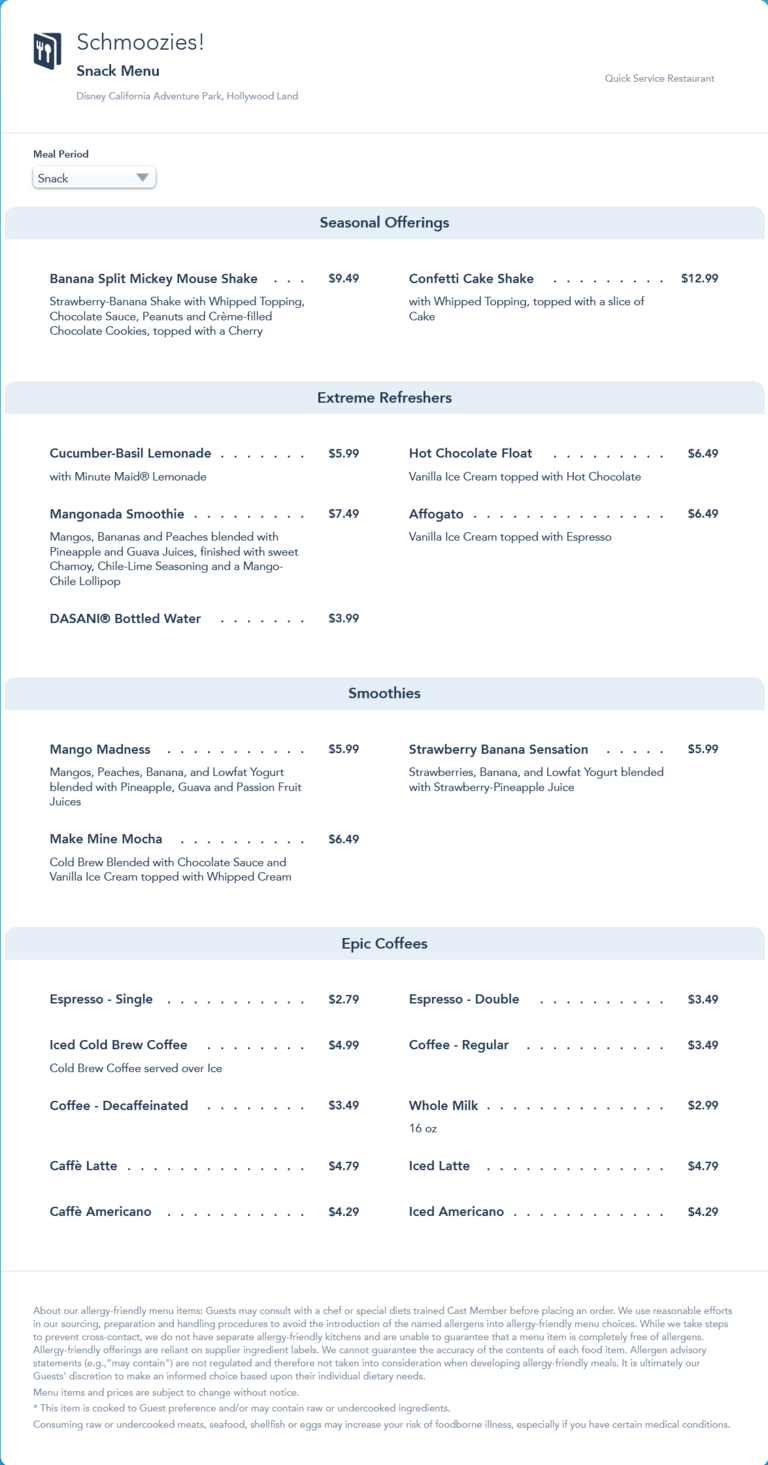 Schmoozies! Snack Menu - May 2022