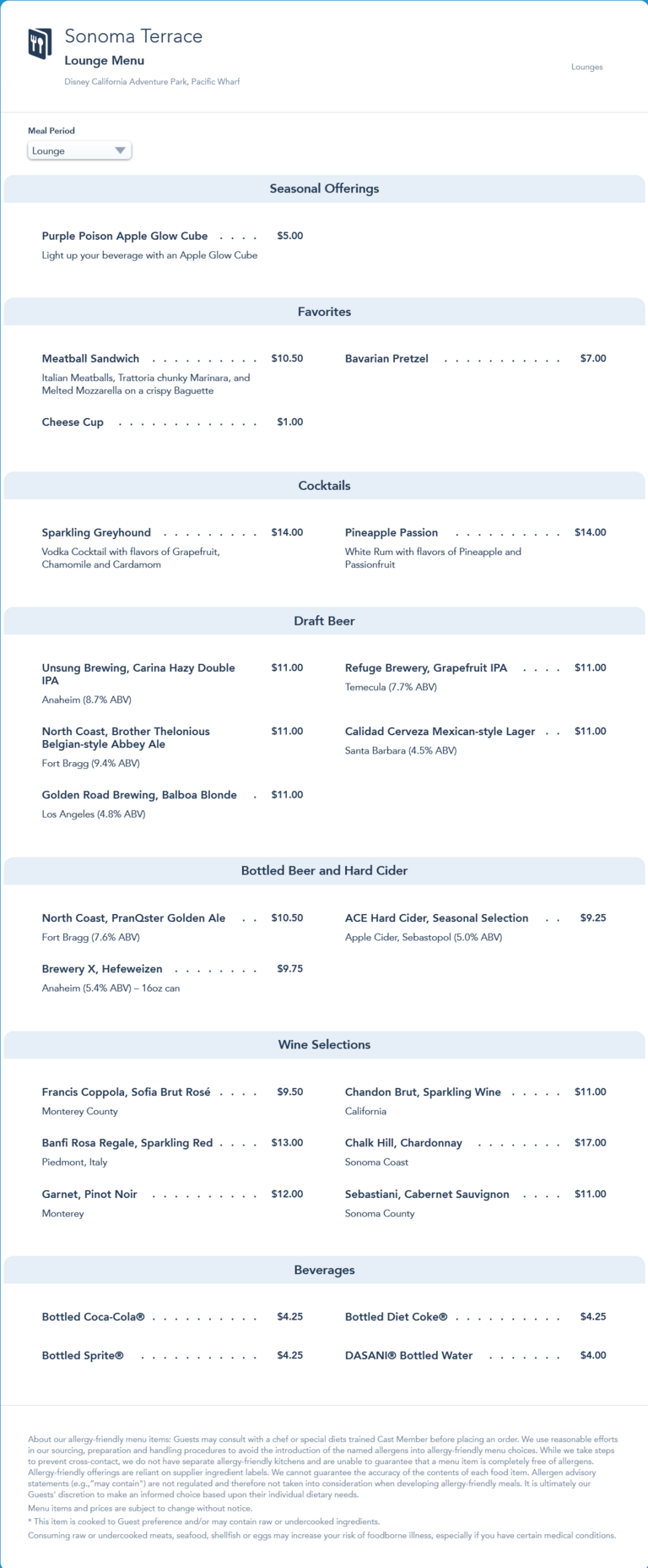 updated menu in November 2021 that: