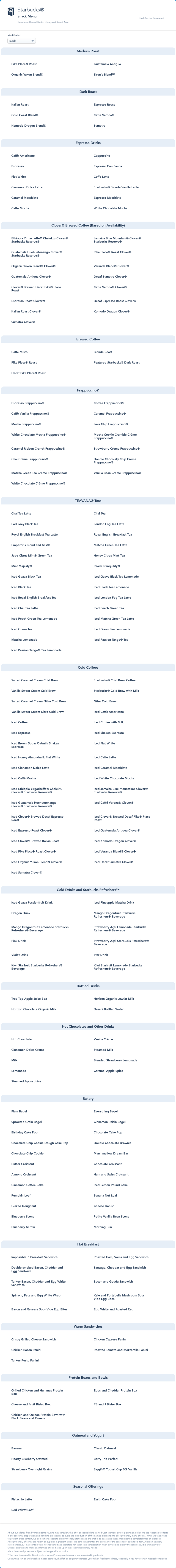 Starbucks Snack Menu - January 2022