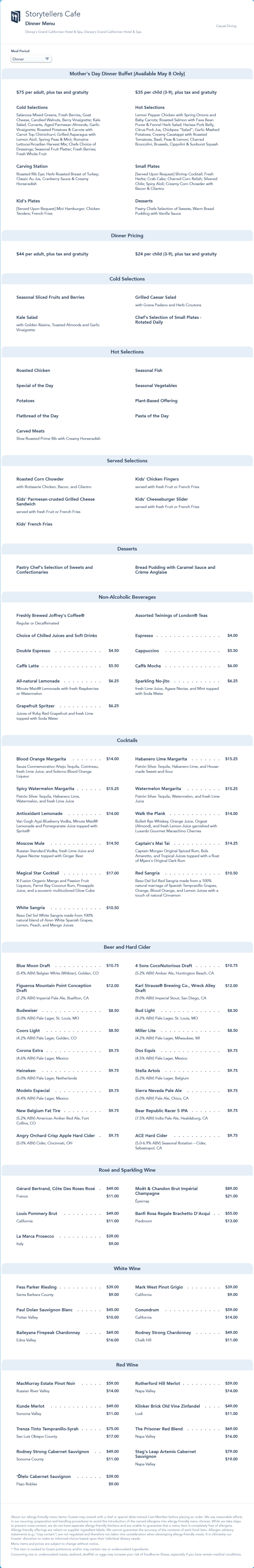 Storytellers Cafe Dinner Menu - Mother's Day 2022