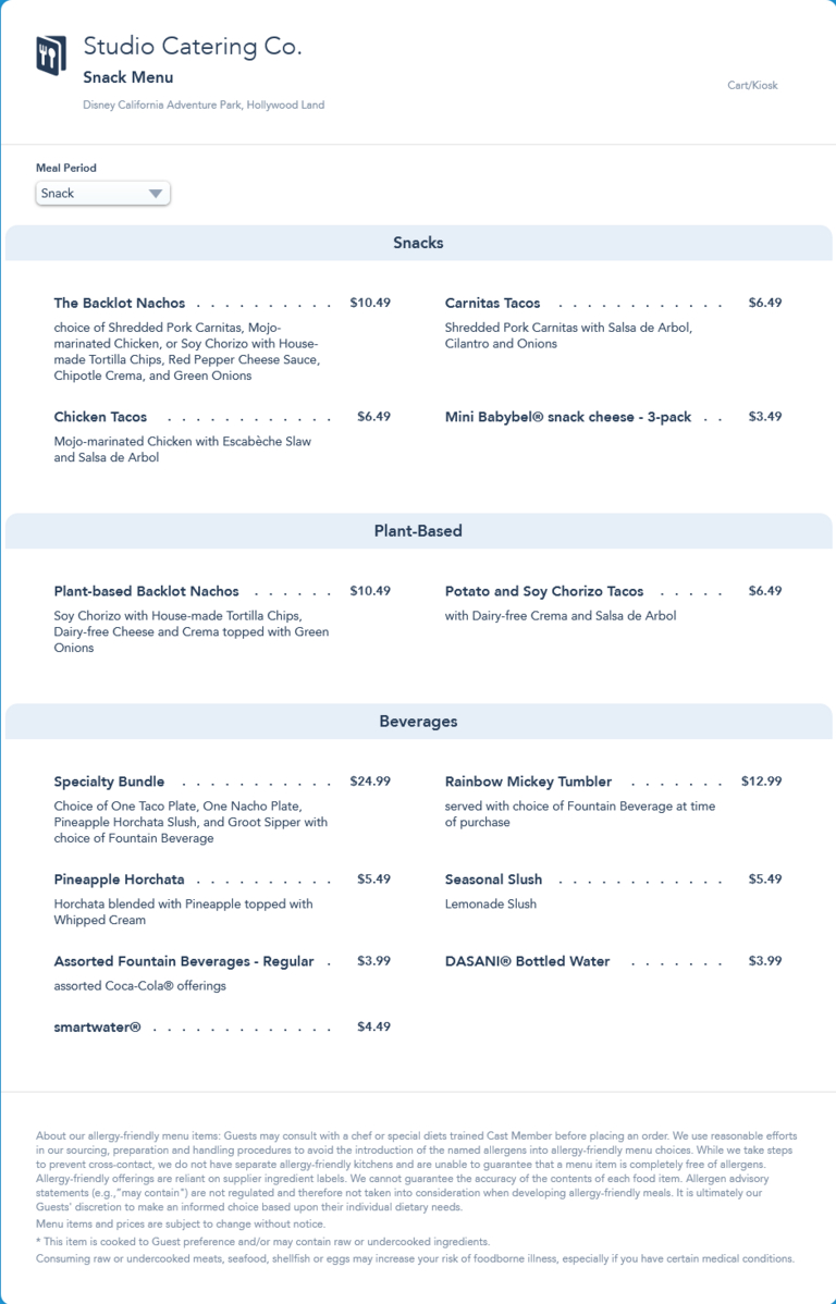 Studio Catering Co.'s reopening menu from April, 30th, 2021. This menu was replaced by an updated menu in July 2021, that changed the seasonal slush flavor from Lemonade to Strawberry Lemonade and added the Rocket & Groot Straw Clip.