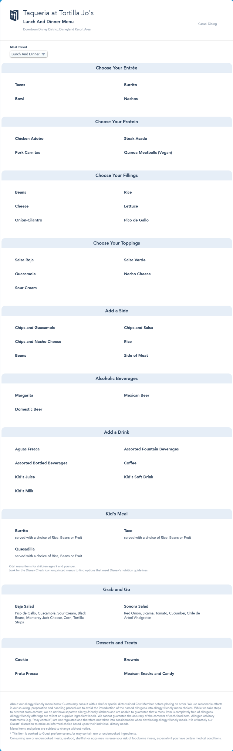 Taqueria at Tortilla Jo's Lunch/Dinner Menu - May 2021