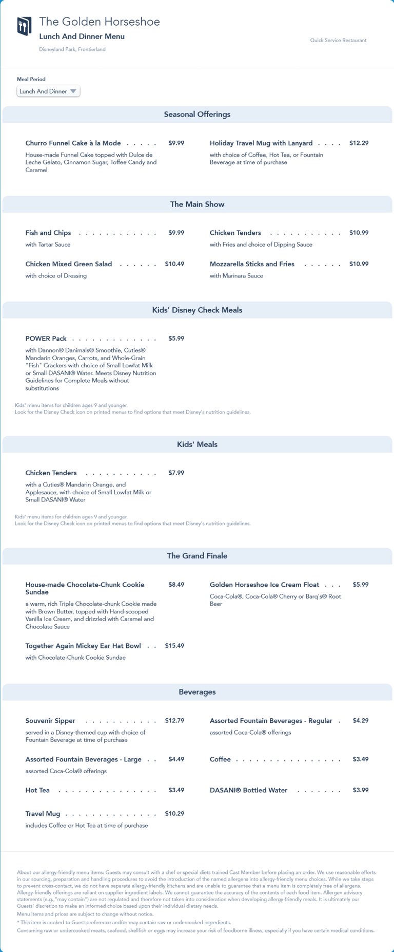 2021 Holiday seasonal menu that included a price increase to the Mickey Hat Ear Bowl ($14.49 to $15.49)