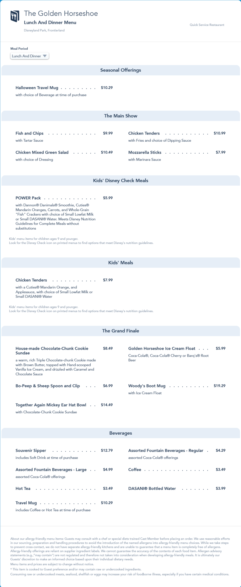 The updated menu also includes a $1 price increase to the Together Again Mickey Ear Hat Bowl with Sundae, from $14.49 to $15.49.