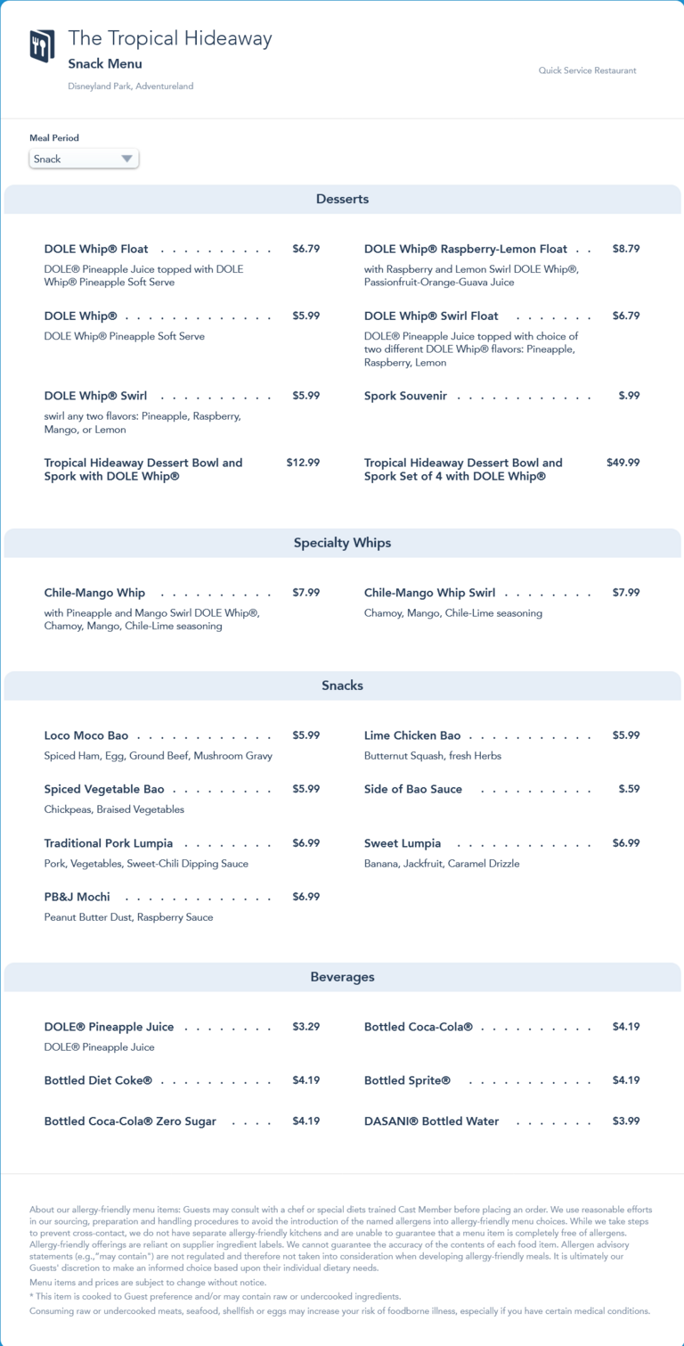 The Tropical Hideaway's menu from July, 2021. This menu was replaced by an updated menu in mid-July that includes the limited-time Pineapple Split - two peaks of Dole Whip, with Coconut Caramel Sauce, Tropical Fruit Gummies, Hibiscus, Toasted Coconut and two Pineapple Spears. The Split comes with a souvenir Jungle Cruise boat to commemorate the launch of the movie.