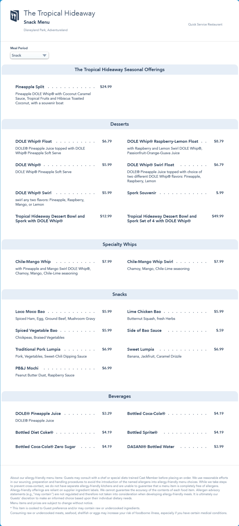 This menu was replaced by an updated menu in September 2021 that removed the Pineapple Split seasonal offering and increased the prices of Bottled Beverages.
