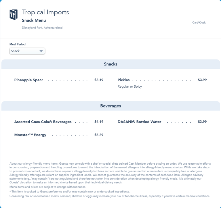 Tropical Imports Snack Menu - June 2021