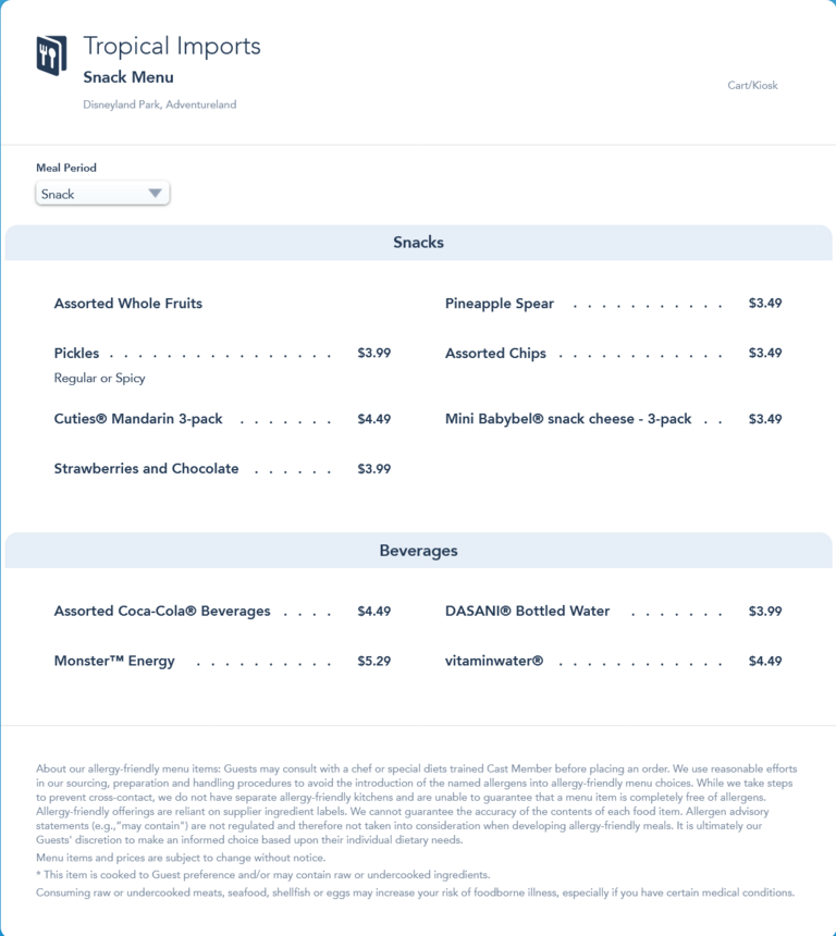 Tropical Imports Snack Menu - May 2022