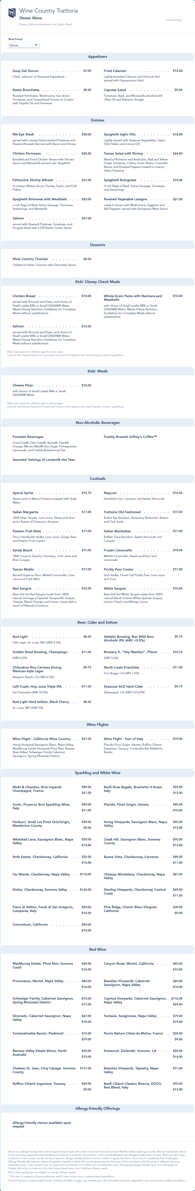 Wine Country Trattoria Dinner Menu - May 2022