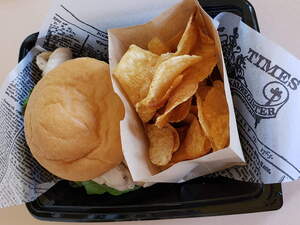 This meal contains eggs (bun) and soy (house-made chips). It may be possible to make it soy-friendly by substituting or removing the house-made chips.