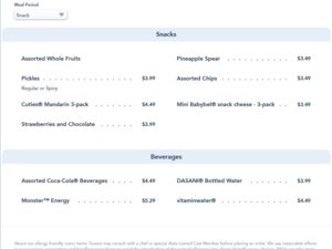 Fuel your safari with healthy provisions at this snack stand in Adventureland. Find fruit in all its forms: whole, cut, fresh and dried. Try tropical pineapple or mango! Pickle spears, trail mix, veggie snacks and bottled drinks are also sold.